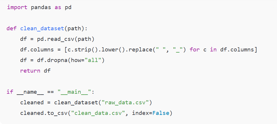 The first rule I followed was ruthless simplicity. I scoped the project to do one thing exceptionally well. The tool ingested raw CSV or Excel files, applied predefined cleaning rules, validated schema consistency, and output ready-to-use datasets along with a concise quality report. Python was the obvious choice due to its ecosystem, readability, and distribution flexibility. I relied on familiar libraries such as pandas for data manipulation and argparse for a clean command-line interface. There was no UI, no cloud deployment, and no database. The entire tool lived as a local executable script, designed to fit naturally into existing workflows.